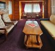 Vybavení chaty je spíše moderní, s dřevěným obložením a v celé chatě jsou dřevěné podlahy, koberce a dlažby. V přízemí je obývací pokoj s krbovými kamny, spojený s jídelnou, samostatná plně vybavená kuchyňka, koupelna se sprchovým koutem, wc, balkon a malá terasa. V prvním patře je druhý balkon a 3 neprůchozí ložnice: 1x2 dvojlůžka, 1x2 lůžka a 1x1 dvojlůžko.
